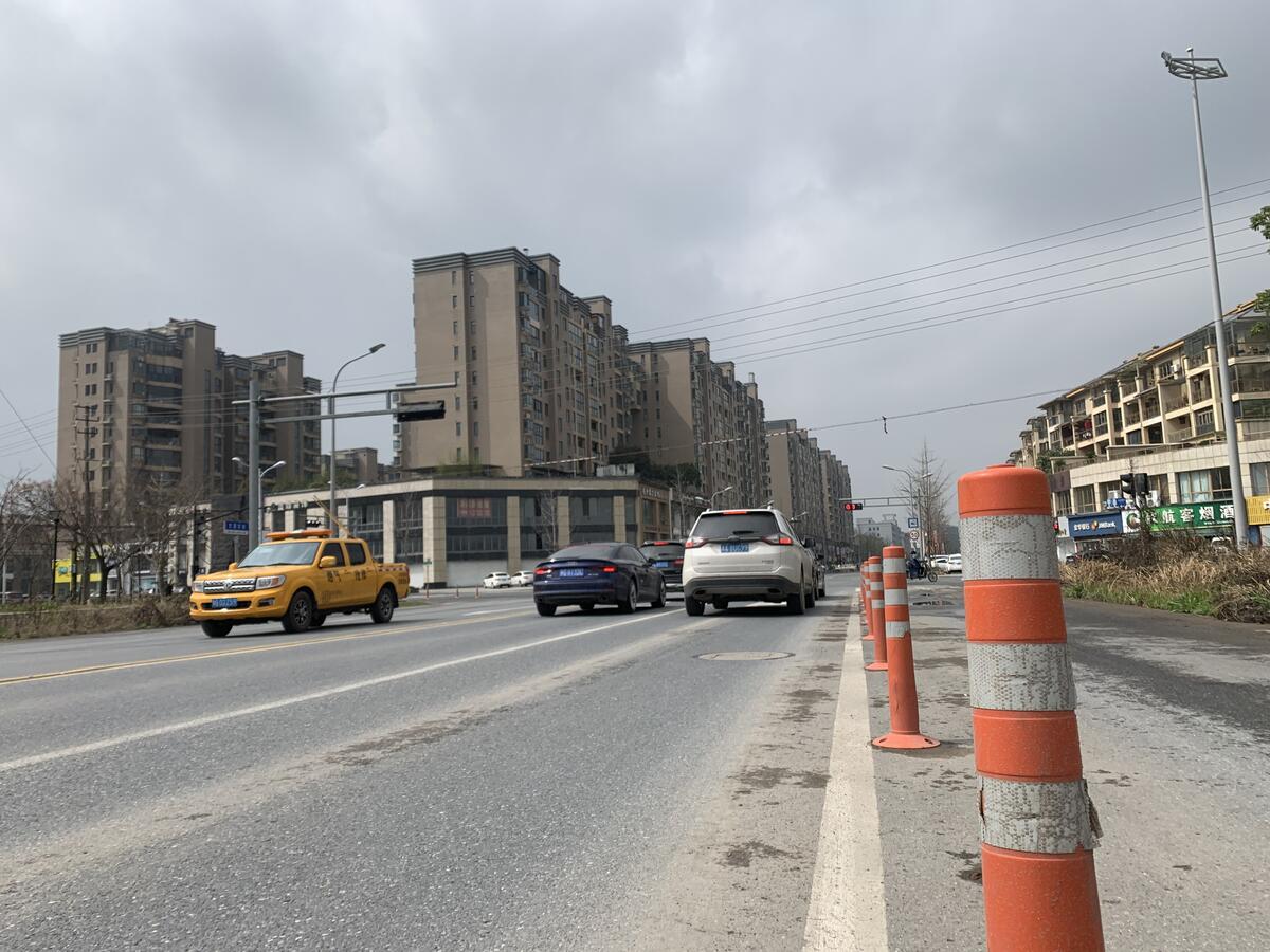 春雨淅瀝,路面濕滑。金華東陽市S217東永線和花廿線交叉口(花墩塘)車流密集,但通行有序。