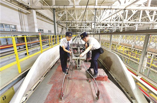 進(jìn)入主汛期以來(lái),太原車輛段針對(duì)夏季高溫及雷雨大風(fēng)天氣頻繁等實(shí)際,及時(shí)進(jìn)行安全預(yù)判,合理制訂日常檢修計(jì)劃,除每日對(duì)列車進(jìn)行全面“體檢”外,重點(diǎn)加強(qiáng)對(duì)車輛受電弓、通風(fēng)設(shè)施、煙火報(bào)警等裝置的監(jiān)測(cè)監(jiān)控,確保動(dòng)車組健康上線,守護(hù)旅客平安出行。圖①為機(jī)械師對(duì)車頂高壓設(shè)備的絕緣子進(jìn)行檢修。圖②為機(jī)械師對(duì)車輛受電弓進(jìn)行檢修。張晉彤 攝
