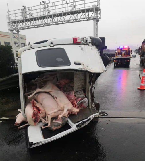 2022年2月7日下午3點半左右,紹興高速交警指揮中心接到駕駛員報警:在G1522常臺高速公路往嘉興方向215處有一輛小型車輛撞中央護欄,側(cè)翻在第一車道。接到報警后,紹興三大隊民警王錦霞和輔警羅人杰立即趕赴事故現(xiàn)場,在事故后方做好預警迅速上前,看到一輛小型車輛側(cè)翻在第一車道,車輛的前部,尾部,側(cè)面均受損,后門打開,一只只宰好的新鮮羊肉向外露出,所幸人員沒有受傷,在車輛后方10來米處放了一個防水護欄,后方車輛緩慢通行,現(xiàn)場比較擁堵。民警王錦霞和輔警羅人杰將警示樁在第一車道放好,并且疏導車輛往第二車道,同時呼叫拖車吊車到達現(xiàn)場。由于側(cè)翻在第一車道,車輛吊正、疏通現(xiàn)場,具有一定難度,加上后方車輛擁堵,開過來時間較久,直到晚上5點半左右,現(xiàn)場才被放通。
