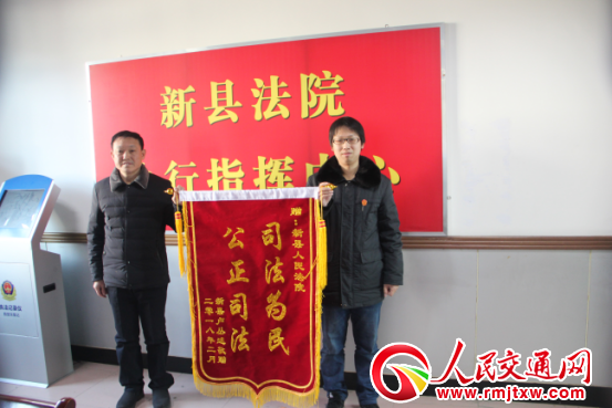 人民交通網(wǎng)訊(盧新生 李艷)2月12日,信陽市新縣陳店鄉(xiāng)居民蘆某、曾某為新縣人民法院送來錦旗,對新縣人民法院執(zhí)行局將12 萬余元標的款順利執(zhí)行到位表示感謝。