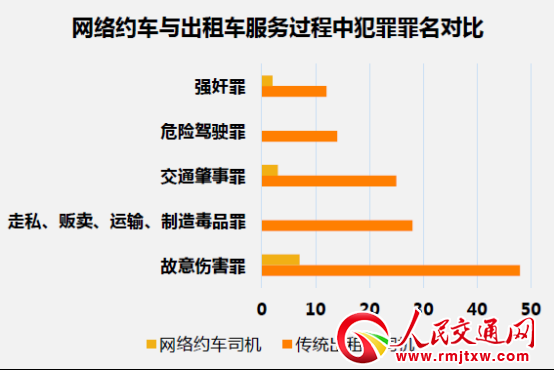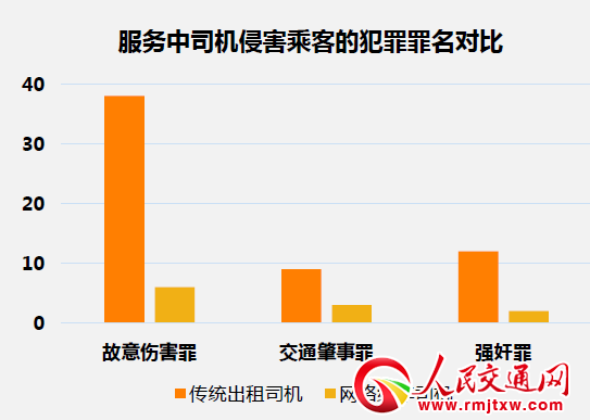 從絕對數(shù)量來說,出租車司機(jī)對乘客故意傷害罪38起,網(wǎng)絡(luò)約車6起,前者是后者6.3倍。出租車司機(jī)強(qiáng)奸乘客12起,網(wǎng)絡(luò)約車司機(jī)2起,前者是后者6倍。