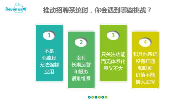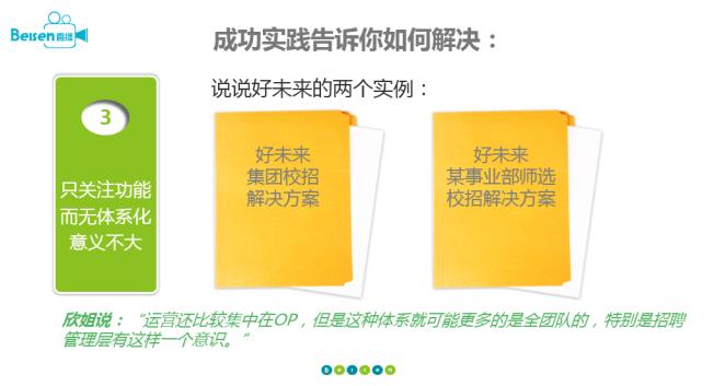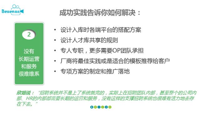 就像剛才談到的運(yùn)營方面,并不是上了招聘系統(tǒng)就完事兒的,實(shí)際上在招聘團(tuán)隊(duì)內(nèi)部,甚至整個(gè)公司內(nèi)部、HR內(nèi)部都需要長期的運(yùn)營和服務(wù),沒有這樣的支撐,招聘系統(tǒng)也很難有活力存在下去。