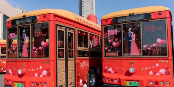 “520”(諧音:我愛你)主題公交著力打造“愛情公交”,投放在市區(qū)15路公交線路中,總計18輛,車身整體為粉紅色,車廂內(nèi)也是浪漫滿分,隨處可見“愛的表白”“暖心話語”等,更傳遞著年輕化、時尚化。