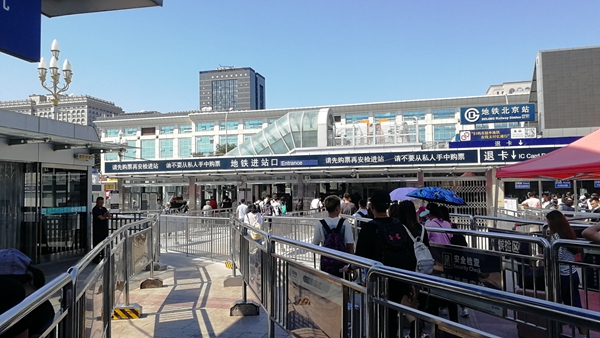 地鐵北京站緊鄰北京火車站,車站西南進站口與北京火車站共用一個站前廣場,從北京火車站抵京的乘客中,約70%的乘客選擇乘坐地鐵前往目的地。目前地鐵北京站日均進出站量超過16萬人次,乘客在站前廣場購票、安檢后進入車站。