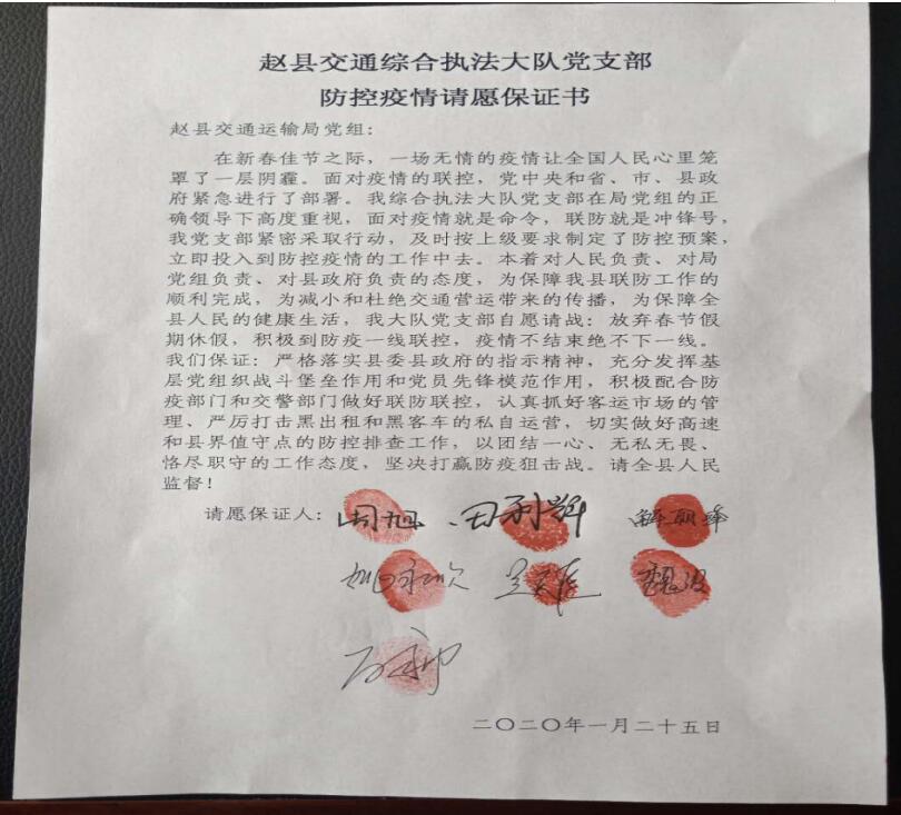 2020年1月22日(臘月二十八),河北省趙縣交通運(yùn)輸綜合行政執(zhí)法大隊(duì)長(zhǎng)周旭,參加省委愛國(guó)衛(wèi)生運(yùn)動(dòng)工作部署電視電話會(huì),得知新型冠狀病毒疫情自武漢席卷而來。他連夜組織大隊(duì)黨員干部召開專題防控工作會(huì)議,緊急部署、分班定責(zé),制定疫情防控工作方案和應(yīng)急預(yù)案,安排應(yīng)急車輛9部(客車2部、貨車2部、出租車5部),要求全體黨員干部嚴(yán)防死守,發(fā)揮帶頭作用,他犧牲年假第一個(gè)在請(qǐng)戰(zhàn)書上按下了手印,“疫情不結(jié)束,決不下一線!”