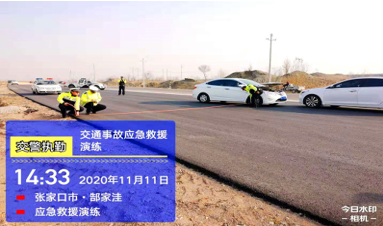演練過(guò)程中模擬兩輛小轎車相撞,造成一人受傷的交通事故。事故中隊(duì)值班民警接到大隊(duì)指揮中心指令,接群眾電話報(bào)警稱:“11月11日14時(shí)許,在宣化區(qū)洋河南鎮(zhèn)郜家洼村南路段,兩輛小轎車相撞,車內(nèi)有人受傷,請(qǐng)派人前往處置。”隨后,交警大隊(duì)指揮中心電話聯(lián)系120急救中心,請(qǐng)救護(hù)車立刻趕往現(xiàn)場(chǎng)救援。