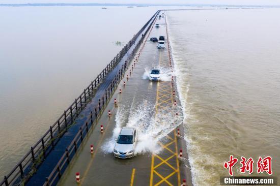 5月24日,受近期持續(xù)強降雨影響,位于江西省九江市永修縣境內(nèi)的永吳公路大湖池段被上漲的湖水漫過,形成了一道獨特的“水上公路”景觀,不少游客駕車慕名而來。永吳公路大湖池段全長5.05公里,每年入汛期間,中國最大淡水湖鄱陽湖水位迅猛上漲,水位達到18.70米時,就會漫過永吳公路大湖池段,形成了一道奇特的水上公路景觀。