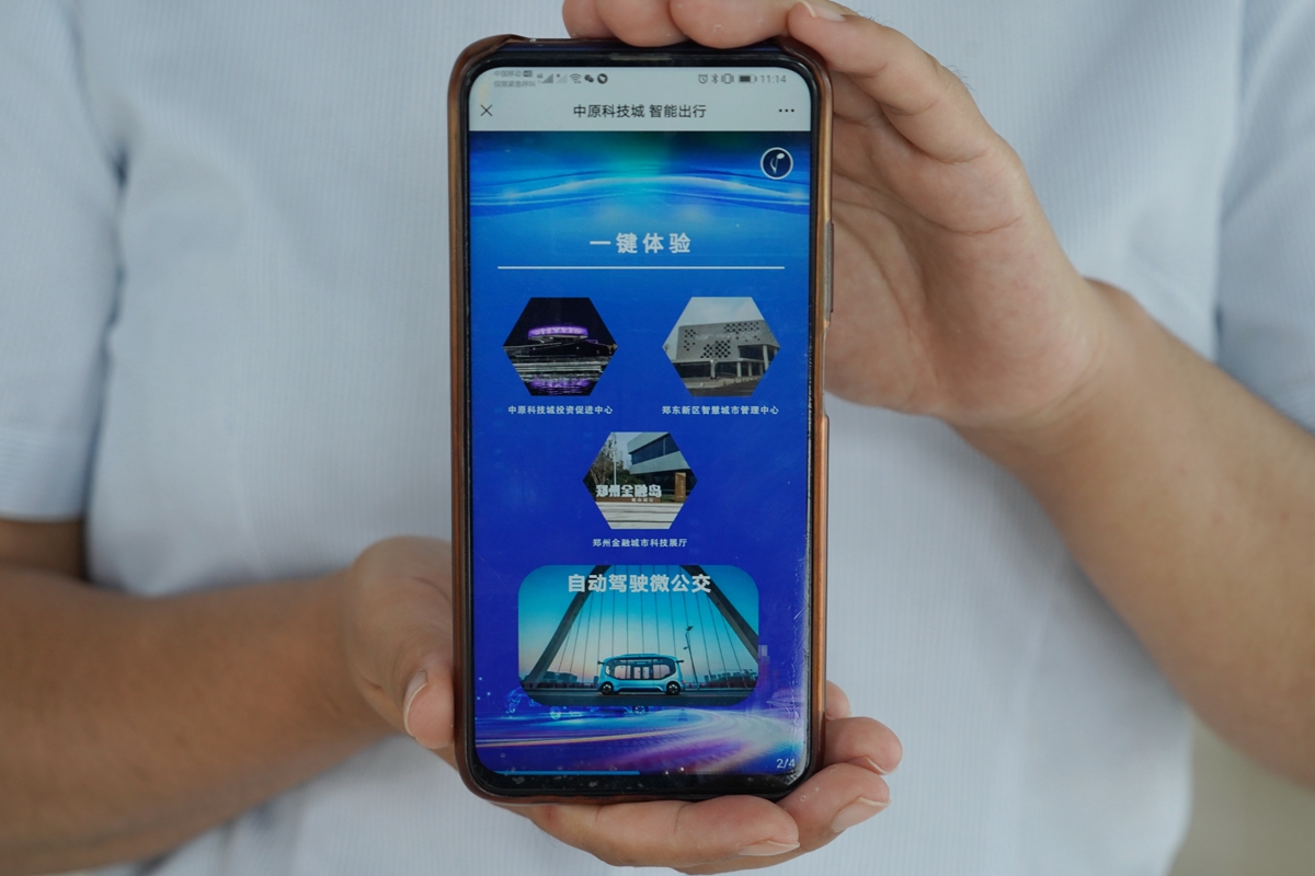 2021年7月1日,河南鄭州,自動(dòng)駕駛巴士和自動(dòng)駕駛乘用車投放鄭東新區(qū),面向市民開放試乘,通過網(wǎng)約模式為市民提供主動(dòng)出行服務(wù)。圖為自動(dòng)駕駛巴士抵達(dá)市民約車地點(diǎn)。 中新社記者 劉鵬 攝