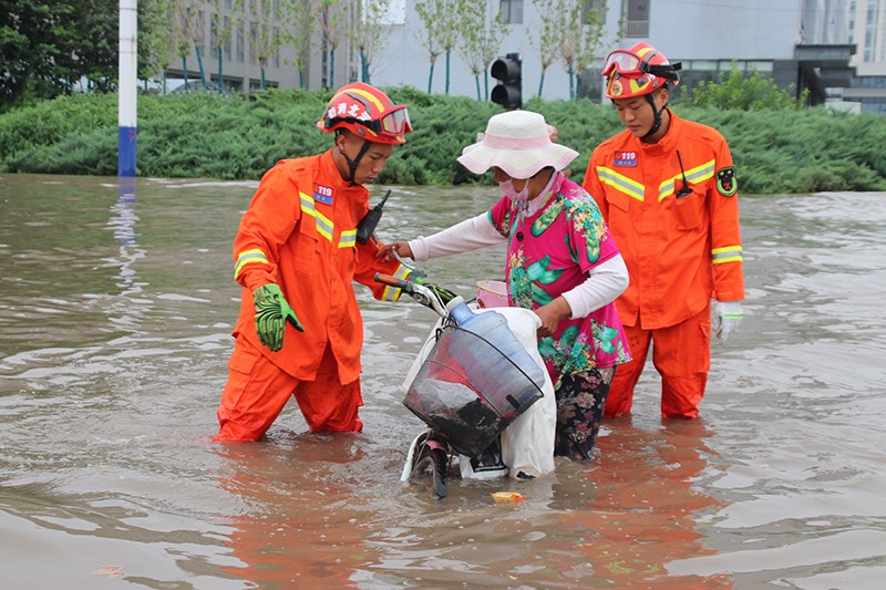 7月18日,河北省石家莊市遭遇暴雨強勢來襲,大量積水涌上路面,給廣大市民生產(chǎn)生活帶來影響。石家莊市消防救援支隊高新區(qū)消防救援大隊奔赴搶險救援第一線,全力以赴做好城市公共區(qū)域排澇工作,盡可能減少暴雨影響,保障人民群眾的出行與生命財產(chǎn)安全。圖為消防救援人員在積水路段進行快速排水、幫助過往群眾安全通行。