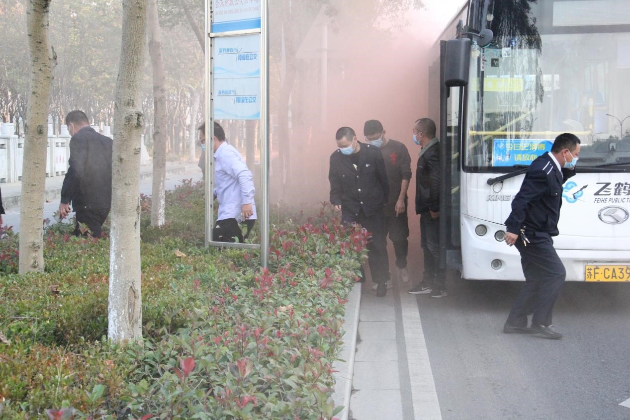 理論培訓(xùn)結(jié)束后,公司常務(wù)副總經(jīng)理胡鋒宣布演習(xí)開始,此時(shí),一輛正常運(yùn)行、載有乘客的公交車忽然發(fā)生自燃,發(fā)動(dòng)機(jī)處冒出濃煙,駕駛員立即選擇安全地帶靠邊停車,當(dāng)機(jī)立斷,迅速打開車門,切斷電源,大喊“不要驚慌,有序下車”,引導(dǎo)乘客快速有序疏散到安全區(qū)域。同時(shí)駕駛員立即撥打“119”火警救援以及向車隊(duì)匯報(bào)。