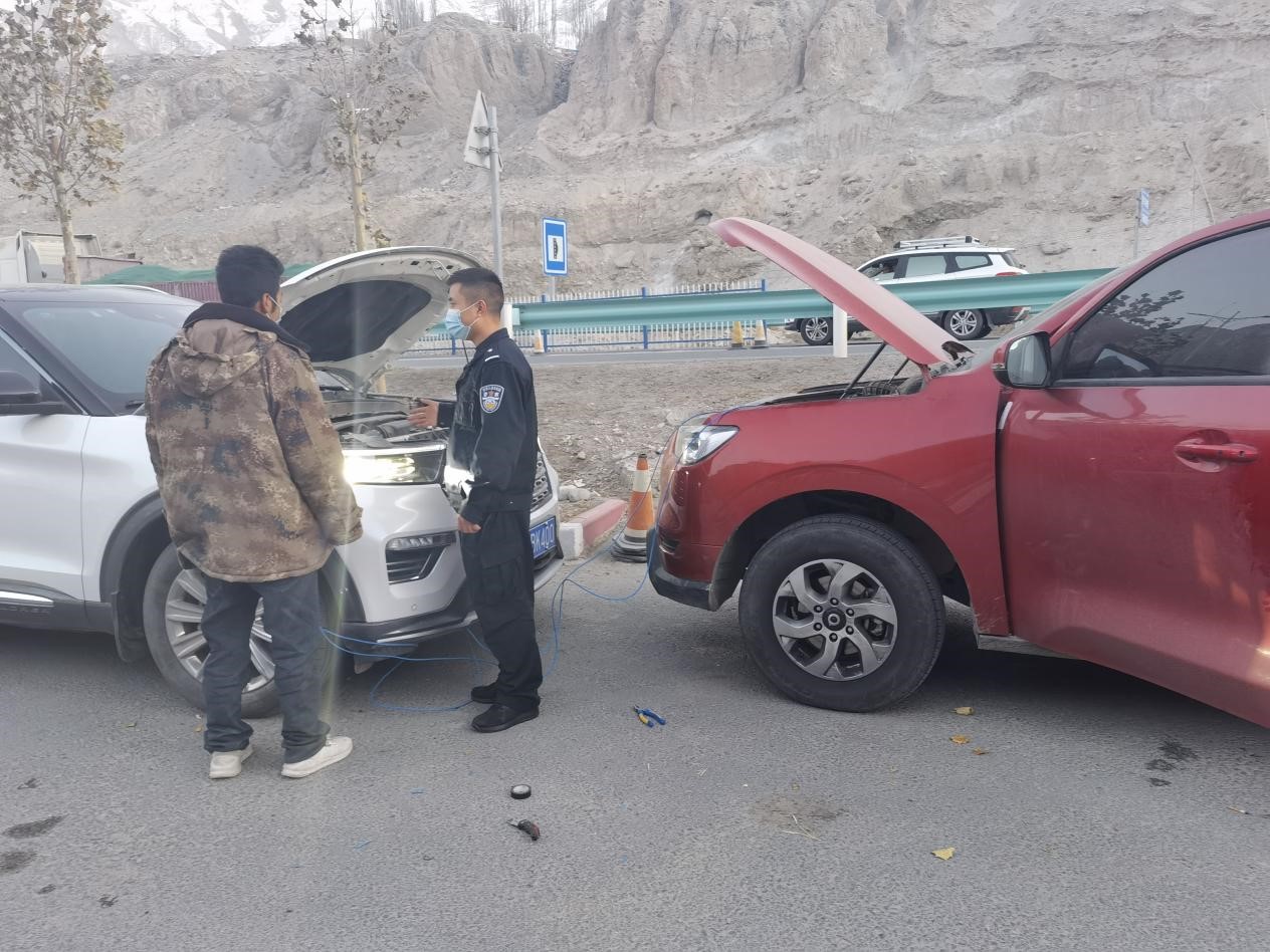 近日,蓋孜邊境檢查站民警在視頻監(jiān)看時(shí),發(fā)現(xiàn)一輛小轎車停在為群眾建造停車場(chǎng),疑似出現(xiàn)故障,無(wú)法啟動(dòng)。民警立即上前了解情況,經(jīng)初步檢查,判斷車輛無(wú)法啟動(dòng)的原因是電瓶沒(méi)電。民警迅速和單位協(xié)警溝通,用協(xié)警車上電瓶為旅客充電,利用電瓶連接線成功點(diǎn)火,順利幫助車主重新啟動(dòng)了車輛。