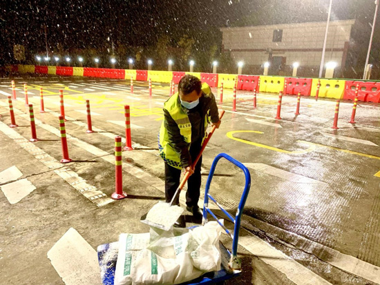 雪情就是命令,駐扎在所轄高速七個工區(qū)應(yīng)急點的養(yǎng)護單位迅速行動,三個綜合巡檢辦全員響應(yīng),分組分路鏖戰(zhàn)在大雪紛飛的沿線高速上。按照“即下、即清、即運”的原則,采取“機械為主、人工為輔”“撒布車在前,大車跟碾壓”的方式,確保高標準、高質(zhì)量、高效率開展清雪除冰工作。