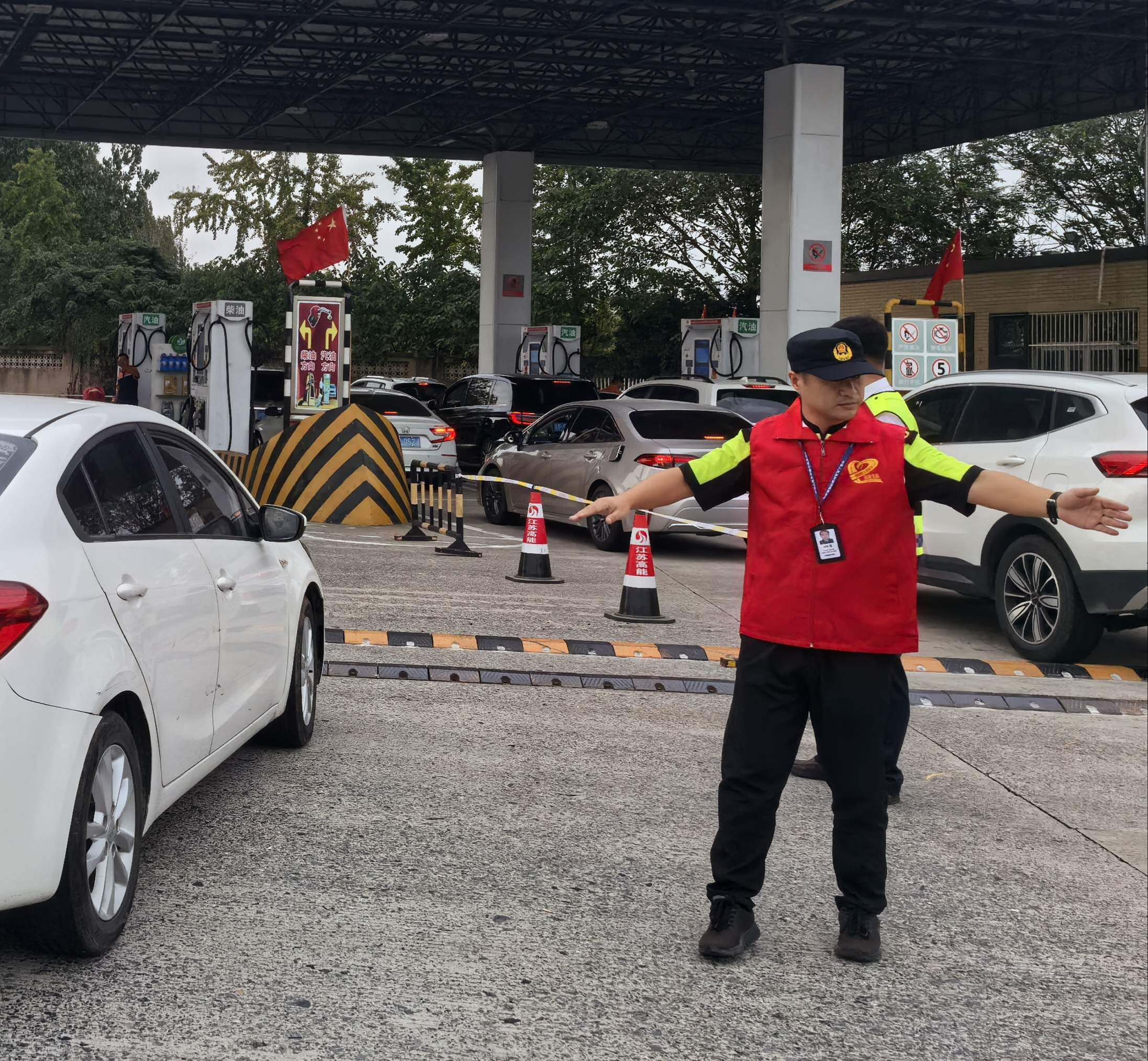 第一分隊(duì)走進(jìn)G15沈海高速公路響水服務(wù)區(qū),開(kāi)展“暖心迎國(guó)慶”志愿服務(wù)主題活動(dòng),在活動(dòng)現(xiàn)場(chǎng),身穿“紅馬甲”的志愿者們,向司乘人員發(fā)放增添節(jié)日喜慶氛圍的小禮品、便民服務(wù)卡和宣傳資料,提供手機(jī)充電、路況咨詢等服務(wù),向他們介紹沿海支隊(duì)968000交通執(zhí)法服務(wù)熱線和路賠案件“異地辦”等便民舉措,詳細(xì)解讀大件運(yùn)輸、道路運(yùn)輸、超限運(yùn)輸?shù)劝讣婕暗男庞眯迯?fù)等政策規(guī)定,當(dāng)天聯(lián)合“一路三方”志愿者共發(fā)放宣傳資料450余份,強(qiáng)化司乘人員法律意識(shí)和安全意識(shí),增進(jìn)司乘人員對(duì)交通執(zhí)法的了解。第二分隊(duì)在G15沈海高速公路射陽(yáng)服務(wù)區(qū),為過(guò)往司乘人員提供出行指南、咨詢、指路等便民服務(wù),發(fā)放應(yīng)景的節(jié)日小禮品以及高速安全行駛須知、國(guó)慶假期江蘇高速公路出行服務(wù)指南等資料,提醒廣大司乘人員安全出行。在G15沈海高速大豐服務(wù)區(qū),一名司機(jī)向第三分隊(duì)“紅馬甲”求助:“請(qǐng)問(wèn)服務(wù)區(qū)的充電站排隊(duì)太久了,車輛電也不多了,再往前開(kāi)有充電的地方嗎?”。“您別急,現(xiàn)在您可以向北從大豐收費(fèi)站下高速,附近有很多充電站,不必在高速排久隊(duì)。充電間隙您和家人可以吃飯、逛街休息,緩解旅途疲勞。” 第三分隊(duì)“紅馬甲”熱情耐心地回答,當(dāng)天第三分隊(duì)共組織堵點(diǎn)疏導(dǎo)9個(gè)余小時(shí),為群眾提供路線指引等服務(wù)40余人(車)次,開(kāi)展法治宣傳發(fā)放各類宣傳單頁(yè)90余份。第四分隊(duì)志愿者們則在G15沈海高速公路如皋服務(wù)區(qū),開(kāi)展“情滿旅途”志愿服務(wù)活動(dòng),為國(guó)慶期間的出行群眾送上暖心服務(wù),第四分隊(duì)志愿者們有的在疏導(dǎo)交通堵點(diǎn)、有的在維持停車秩序、有的在提供路況咨詢、有的在提供便民服務(wù),志愿服務(wù)場(chǎng)景隨處可見(jiàn),活動(dòng)期間共張貼各類宣傳海報(bào)30余張,發(fā)放路況指南80余份,累計(jì)為司乘人員提供法律、路況咨詢服務(wù)120余人次,提供免費(fèi)茶水100余杯。