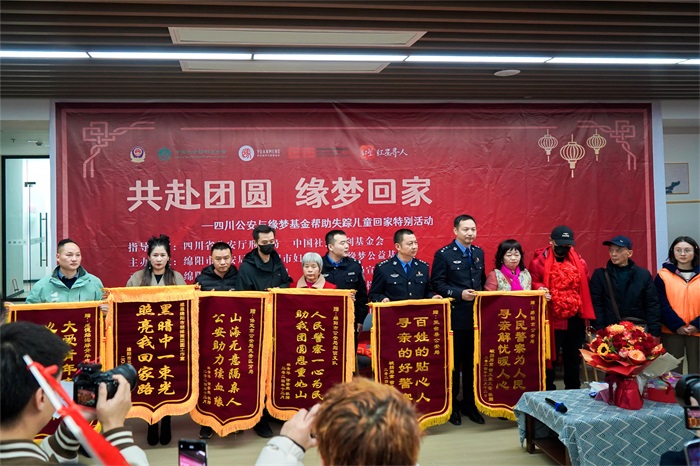活動現(xiàn)場,為了向志愿者表達感激之情,盧鳳霞夫婦將一面錦旗贈送給了成德綿公司。在場的尋親家長們,在得知成德綿公司所從事的這項尋親志愿服務項目后,紛紛上前與海豚青年志愿者合影留念,以便更好的擴散他們孩子的信息。志愿者們也耐心地將這些尋親家長的聯(lián)系方式一一記錄下來,計劃后續(xù)將這些信息錄入到走失兒童信息庫,為更多家庭的團圓之夢貢獻力量。