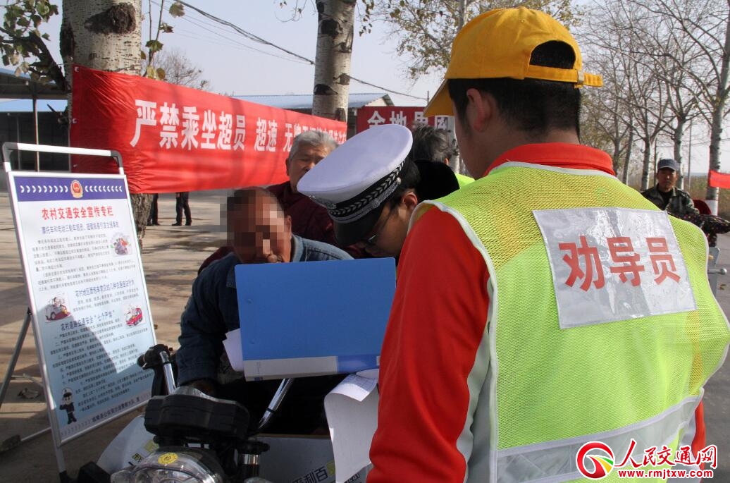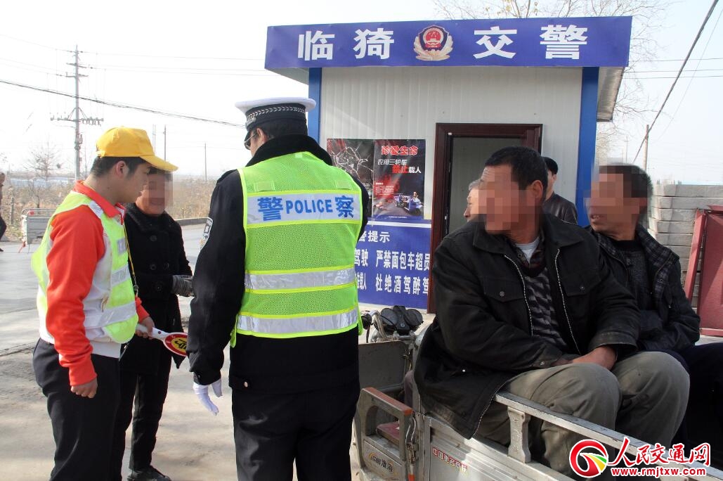 圖為11月28日,臨猗交警大隊民警配合北景村勸導(dǎo)站的勸導(dǎo)員,對三輪車違規(guī)載人、面包車超員等違法行為進行勸阻和糾正,并對駕駛員進行批評教育。