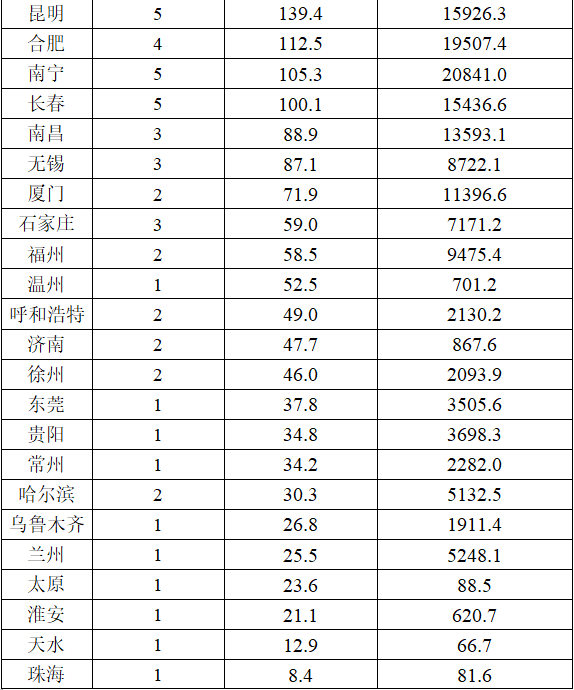 圖為城市運(yùn)營里程由大到小排序,其中昆山市5.96公里地鐵線路為上海地鐵11號(hào)線延伸線,
