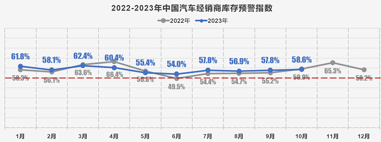 2023年10月31日,中國汽車流通協(xié)會發(fā)布的最新一期“中國汽車經(jīng)銷商庫存預警指數(shù)調(diào)查”VIA(Vehicle Inventory Alert Index)顯示,2023年10月中國汽車經(jīng)銷商庫存預警指數(shù)為58.6%,同比下降0.4個百分點,環(huán)比上升0.8個百分點,庫存預警指數(shù)位于榮枯線之上,汽車流通行業(yè)處在不景氣區(qū)間。