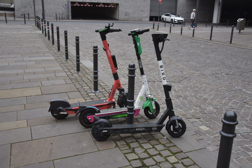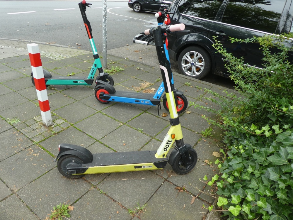 當(dāng)?shù)貢r間2021年7月6日,德國北萊茵-威斯特法倫州,人行道中間停著一輛電動滑板車。圖、文字源自IC
