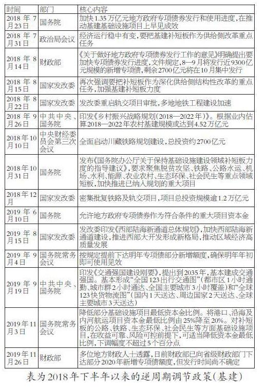 然而,公路建設(shè)資金面的整體好轉(zhuǎn)僅靠融資結(jié)構(gòu)來(lái)支持遠(yuǎn)遠(yuǎn)不夠。眾所周知,2019年6月,專(zhuān)項(xiàng)債可充當(dāng)資本金的條例出臺(tái)后,市場(chǎng)產(chǎn)生了較為樂(lè)觀的預(yù)期,普遍預(yù)測(cè)基建投資增速將回升,在6%―10%。然而,截至2019年11月,基建投資完成額增速依舊保持在4%―5%的近年低位,并未明顯好轉(zhuǎn)。在這種情況下,自2018年起依托基建的逆周期調(diào)節(jié)不斷加碼,并且這種調(diào)節(jié)節(jié)奏在2019年進(jìn)一步提速,包括允許地方政府專(zhuān)項(xiàng)債券作為符合條件的重大項(xiàng)目資本金、印發(fā)《西部陸海新通道總體規(guī)劃》推進(jìn)西部大開(kāi)發(fā)、印發(fā)《交通強(qiáng)國(guó)建設(shè)綱要》并設(shè)立2035年基本建成交通強(qiáng)國(guó)目標(biāo)、降低部分基礎(chǔ)設(shè)施項(xiàng)目最低資本金比例、按規(guī)定提前下達(dá)2020年專(zhuān)項(xiàng)債部分新增額度等?梢灶A(yù)見(jiàn)的是,在“不搞大水漫灌”的政策基調(diào)下,為了托底經(jīng)濟(jì),至少2020年上半年這種依托基建開(kāi)展的逆周期調(diào)節(jié)很有可能繼續(xù)加碼,而這種政策面的不斷加碼,也將為包括公路建設(shè)在內(nèi)的基建創(chuàng)造更加寬松的資金面環(huán)境。
