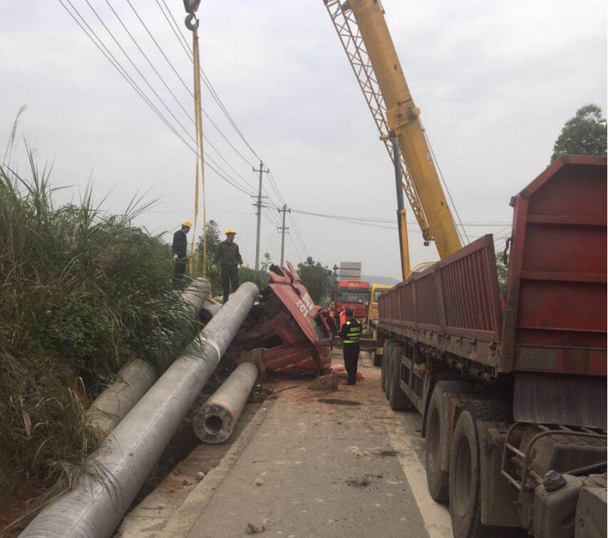 當(dāng)天上午10時(shí)許,在G105線(xiàn)K2169+300處,一輛運(yùn)輸水泥電桿的掛車(chē),為避讓一部小車(chē),直接撞上路肩旁的漿砌片石水溝里,車(chē)上若干根水泥桿傾倒至水溝,現(xiàn)場(chǎng)一片狼藉,事故損壞水溝約40m;由于G105線(xiàn)過(guò)往車(chē)輛較多,車(chē)流量大,又是急彎路段,若不及時(shí)將車(chē)輛移開(kāi),清除損壞雜物,極有可能引發(fā)二次事故。