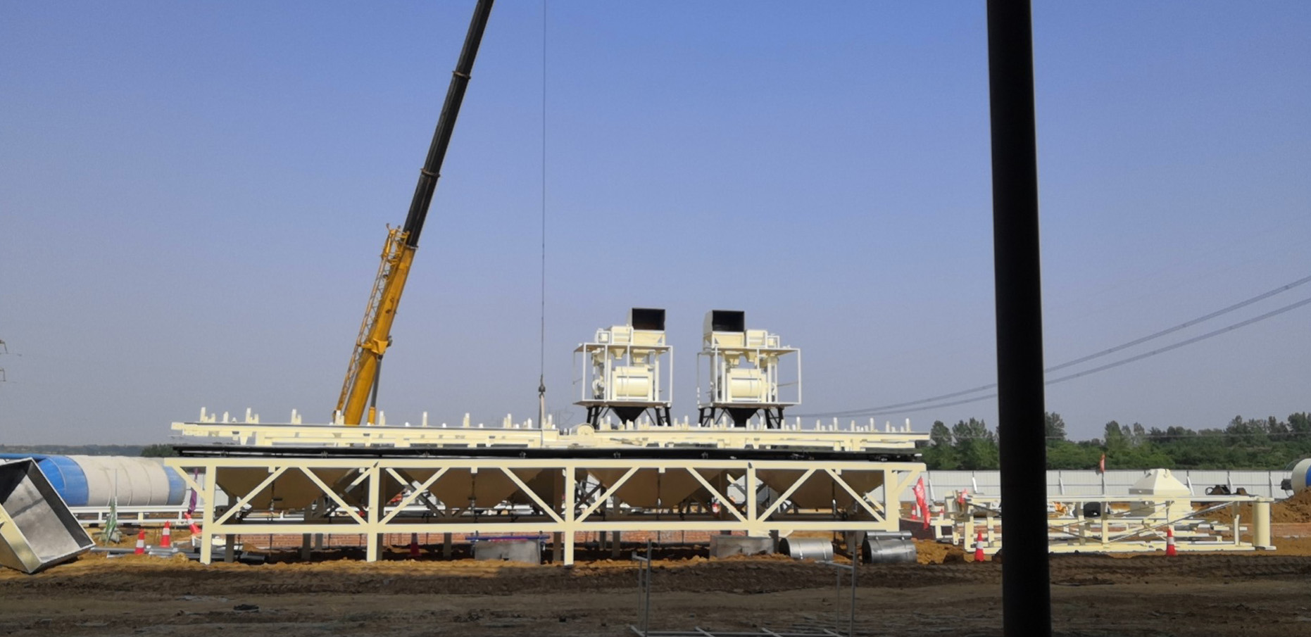 上圖為K0+800拌合站拌合機(jī)兩臺(tái)已經(jīng)架設(shè)完畢,斜皮帶安裝完成一個(gè)。