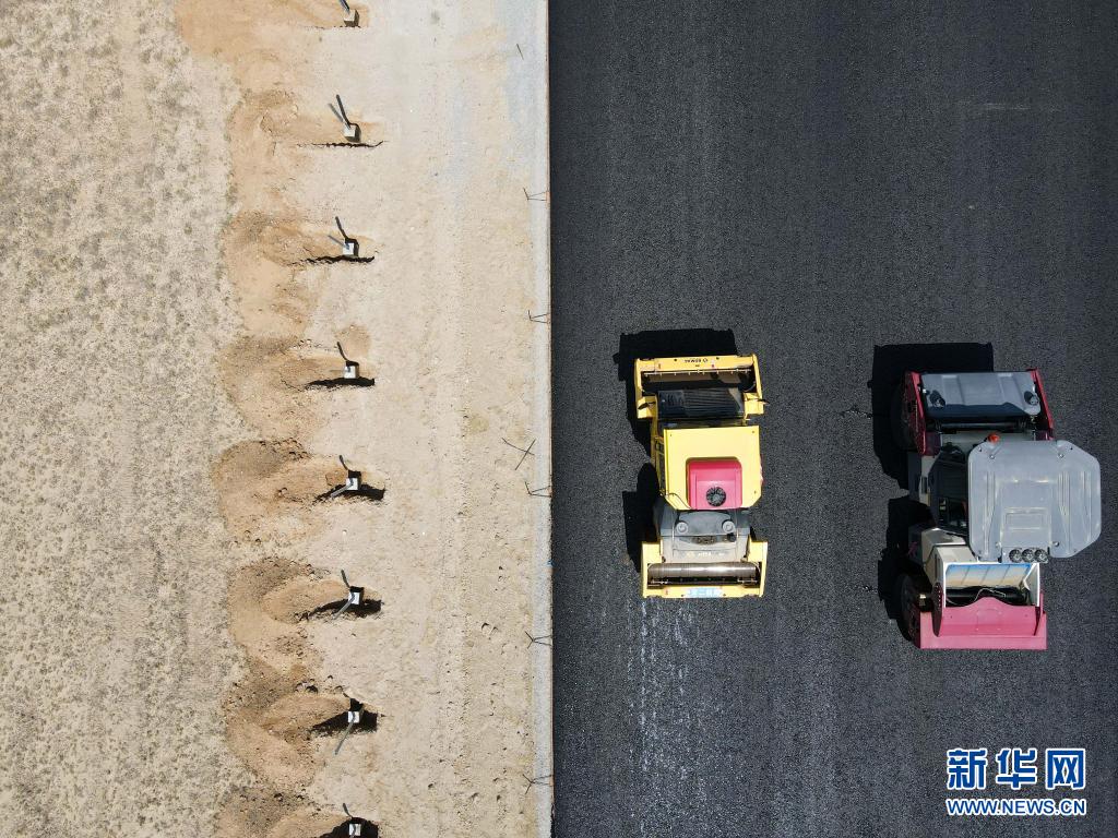 工人駕駛機械在阿烏高速二期工程施工現(xiàn)場進行瀝青攤鋪(無人機照片,7月16日攝)。