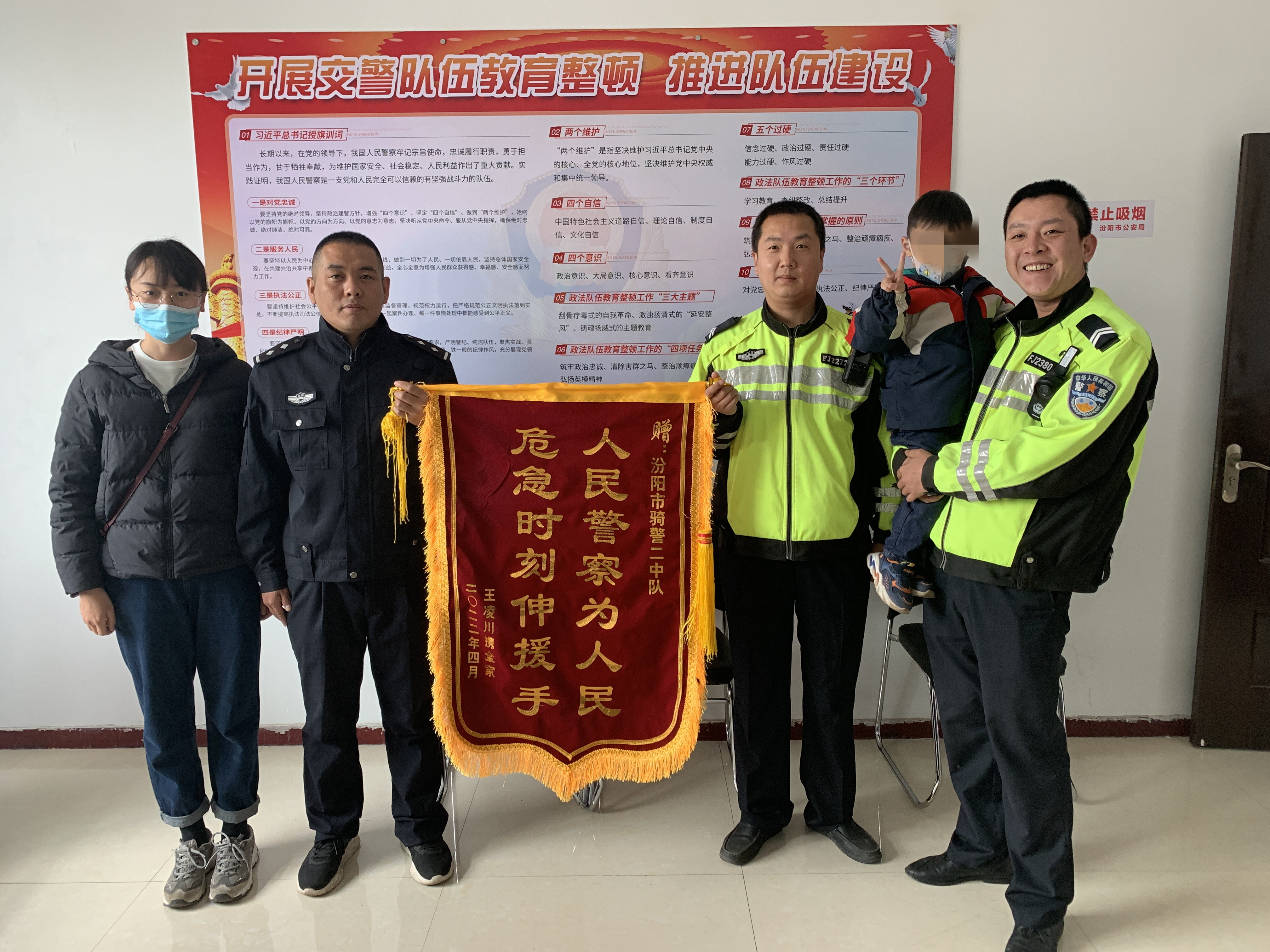 2022年4月28日上午,汾陽市市民王先生將一面繡有“人民警察為人民,危急時刻伸援手”的錦旗送到了騎警二中隊民警手中,并一再向民警表示感謝,激動之情溢于言表。