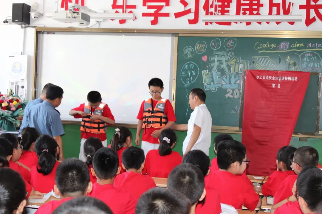 執(zhí)法人員王衛(wèi)東親身示范了救生衣的規(guī)范穿著和救生圈正確使用的方法,并指導(dǎo)學(xué)生現(xiàn)場完成救生衣穿戴,讓同學(xué)們在輕松愉快的互動(dòng)中掌握了水上安全基本防護(hù)技能。