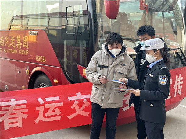 2023年春節(jié)臨近,為切實(shí)做好春運(yùn)期間轄區(qū)道路交通安全保衛(wèi)工作,努力為春運(yùn)期間群眾出行創(chuàng)造良好的道路通行環(huán)境。1月5日,汾陽(yáng)交警大隊(duì)宣教股結(jié)合春運(yùn)交通安全管理工作,走進(jìn)汽車站和新凱公交公司開(kāi)展平安春運(yùn)交通安全宣傳活動(dòng),為春運(yùn)交通安全宣傳“預(yù)熱”,筑牢轄區(qū)道路交通“安全防線”。