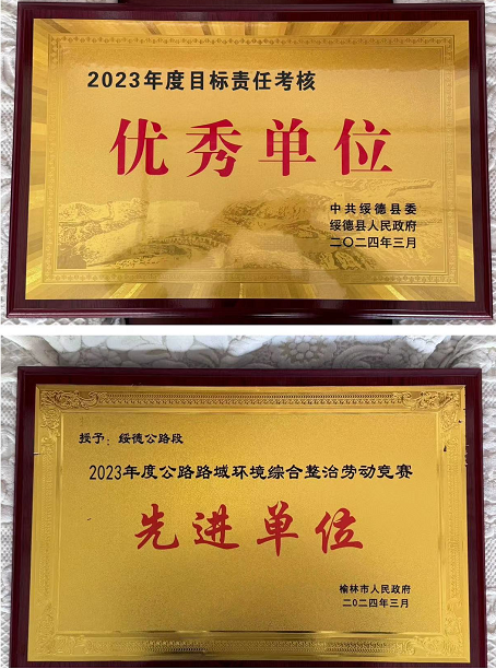 2023年,綏德公路段立足公路事業(yè)發(fā)展大局,始終踐行“以人民為中心”發(fā)展理念,全力以赴抓養(yǎng)護(hù)、保暢通,抓安全、促發(fā)展,在保障公路安全通暢、美化公路環(huán)境中有效發(fā)揮職能作用,被榆林市人民政府授予“2023年度公路路域環(huán)境綜合整治勞動(dòng)競(jìng)賽先進(jìn)單位”榮譽(yù)稱(chēng)號(hào);被綏德縣委縣政府授予“2023年度目標(biāo)責(zé)任考核優(yōu)秀單位”榮譽(yù)稱(chēng)號(hào)。