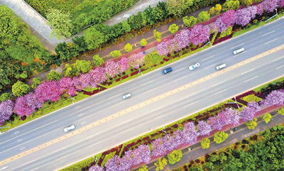 4月12日,廣西柳州市道路兩側(cè)洋紫荊花盛開。