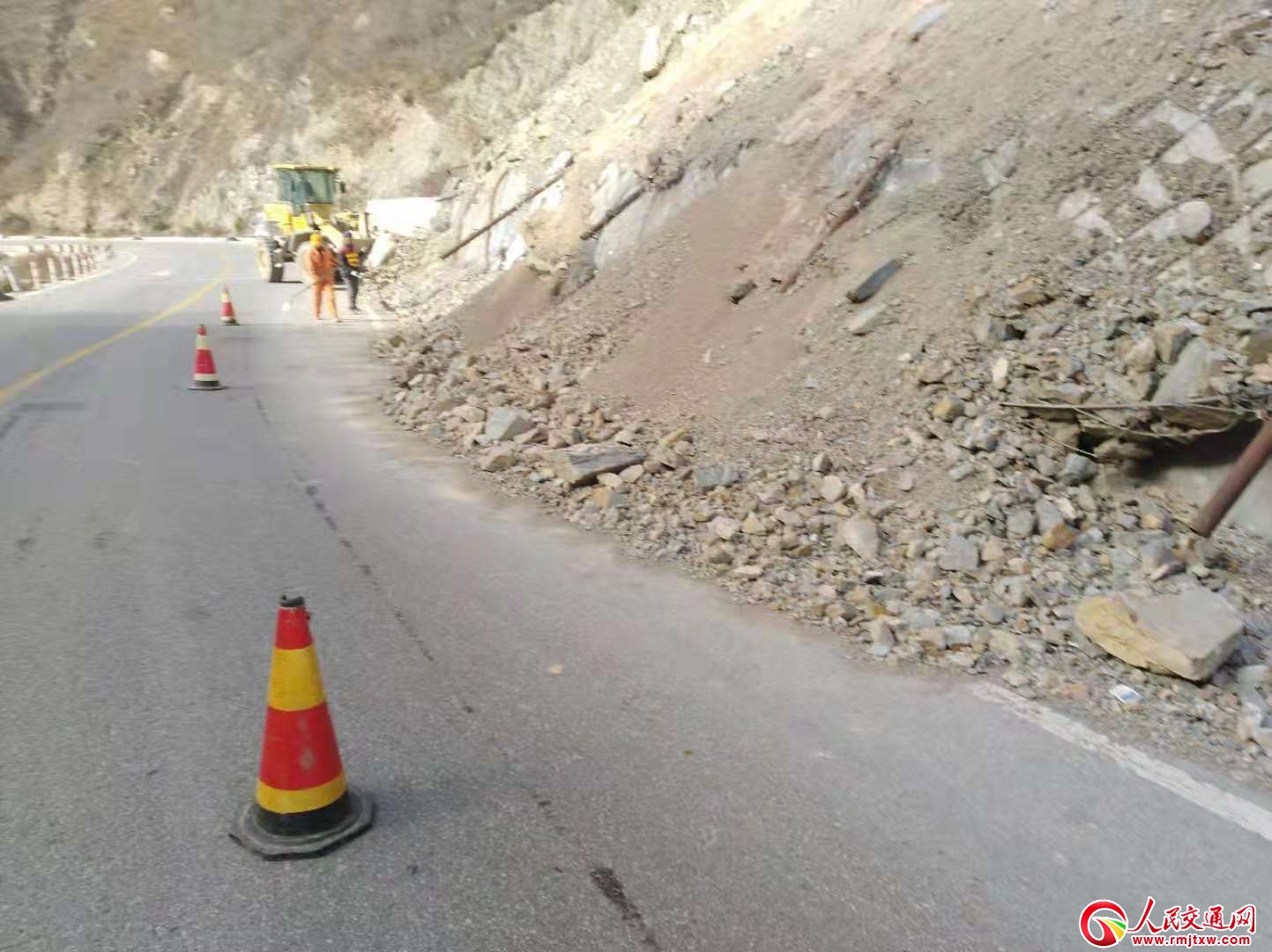 人民交通網(wǎng)訊(通訊員 劉志偉)11月27日上午,S208線洛禮路K55+920處發(fā)生山體塌方落石損壞攔石網(wǎng),造成邊溝填埋,近半幅路面受阻,存在安全隱患。武山公路管理段洛門養(yǎng)管站及時組織職工、機械對落石路面進行緊急安全處置,布設(shè)安全警示標識標牌,清理落石。經(jīng)過近一個小時的不懈努力,路面落石全部清理完畢,消除了安全隱患,保障了該路段的暢通。