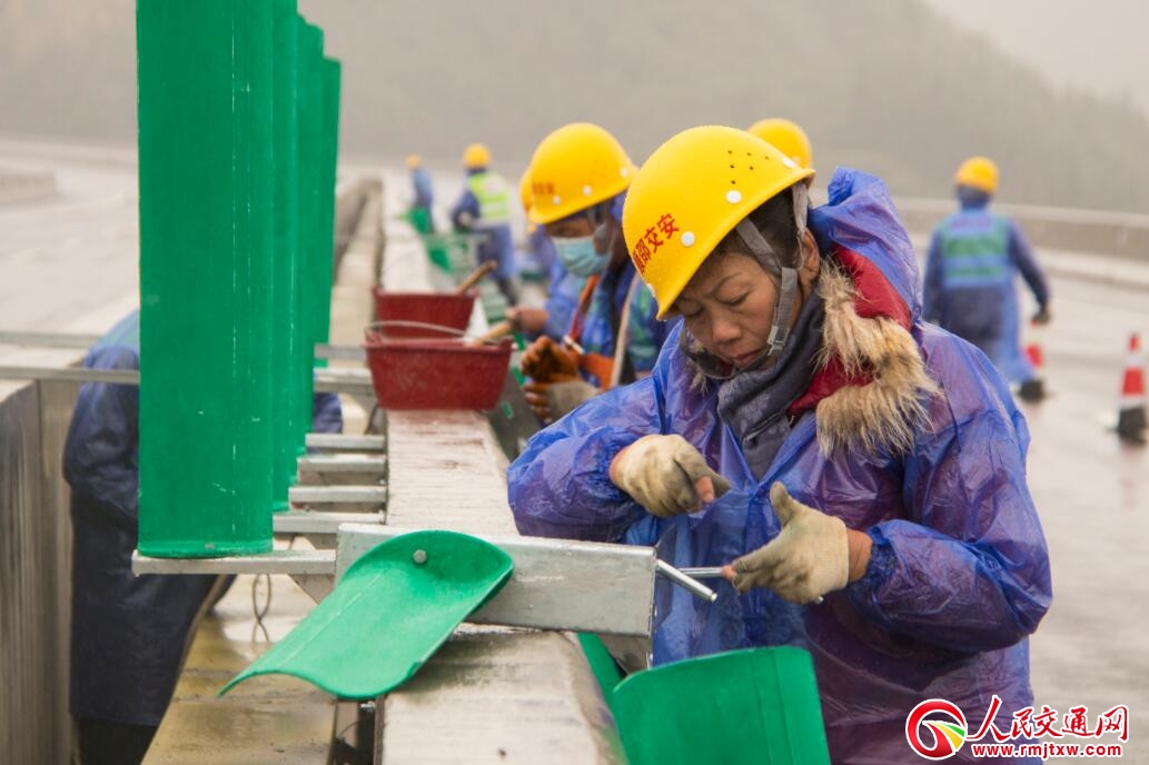 人民交通網(wǎng)訊(通訊員 雒煥鼎)12月13日,兵團(tuán)十一師北新路橋福建順邵高速項(xiàng)目河坊特大橋施工現(xiàn)場(chǎng),順邵交安標(biāo)工人正冒雨安裝大橋防眩板。當(dāng)前順邵高速項(xiàng)目已進(jìn)入最后收尾階段,交工驗(yàn)收工作全面推進(jìn)。