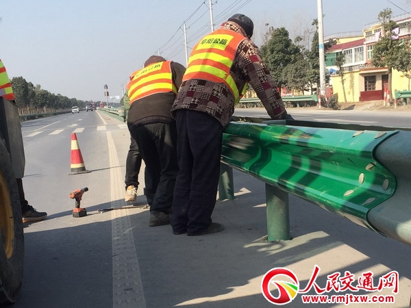 由于前段時(shí)間雨雪及大霧天影響,造成該分局管養(yǎng)的干線公路個(gè)別路段護(hù)欄變形、損毀和歪斜松動(dòng),影響美觀與安全,存在安全隱患。對此,該分局高度重視,認(rèn)真履 行職責(zé),一方面加強(qiáng)道路巡查工作,一方面針對巡查發(fā)現(xiàn)的護(hù)欄存在的問題,現(xiàn)場能整改的,立即進(jìn)行整改,一時(shí)不能整改的,迅速制定維修方案,安排維修人員立 即維修、更換,第一時(shí)間恢復(fù)損毀護(hù)原貌。在護(hù)欄維修中,分局工養(yǎng)科跟班檢查,分局領(lǐng)導(dǎo)現(xiàn)場督促做好維修與加固工作。全體維修人員克服車流量大、路況復(fù)雜及 天寒地凍等困難,起早貪黑逐路段進(jìn)行排查,按技術(shù)規(guī)范要求進(jìn)行檢修,加固護(hù)欄松動(dòng)的鑼絲,扶正立柱,更換護(hù)欄板。截至1月17日,共加固松動(dòng)護(hù)欄10處, 安裝、更換護(hù)欄板7塊,扶正立柱6根,封堵被私拆護(hù)欄1處。
