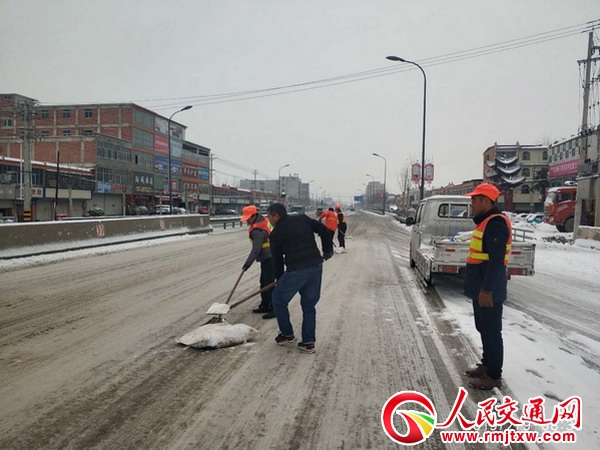 該分局及時下達清雪除冰命令,一方面加強值班值守,隨時掌握路面通阻信息,一方面由分局領導帶隊組織機關科室人員及四個中心道班養(yǎng)護力量、搶險突擊隊等,出 動1臺平地機,1臺裝載機,4臺路政巡查及養(yǎng)護車,開始清除積雪,拋灑融雪劑。搶險突擊隊對重要路段、潁城進出口路段、穿集鎮(zhèn)路段、平交路口、上下坡段、 橋面及其他險段進行清雪,平地機、裝載機負責干線公路路面清雪。路政人員加強巡查,及時通報公路通行情況,發(fā)現(xiàn)積雪打滑路段,立即報告并配合清理積雪。分 局領導現(xiàn)場調(diào)度,保障了清雪除冰工作順利進行。
