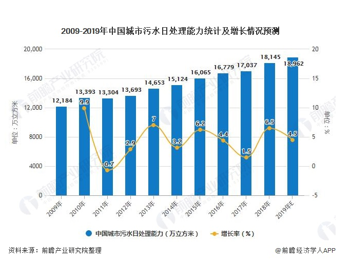 作為環(huán)保行業(yè)中的重要內(nèi)容,污水處理行業(yè)在政府政策的支持下近幾年發(fā)展態(tài)勢較好,污水處理能力持續(xù)增強。國家統(tǒng)計局數(shù)據(jù)顯示,2018年我國城市污水日處理能力已達1.81億立方米,同比增長6.5%。按照2009-2018年年均4.5%的復(fù)合增長率,估計2019年我國城市污水日處理能力可達1.89億立方米。