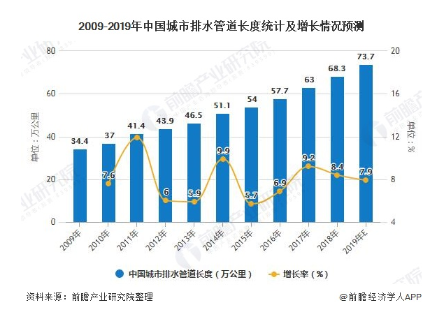 另一方面,近年來,城市排水管道長度加速增長。2018年,全國城市排水管道增加至68.3萬公里,同比增速為8.4%,按照2009-2018年年均7.9%的復(fù)合增長率,預(yù)計2019年中國排水管道長度將突破70萬公里。