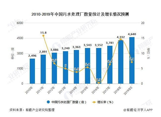 中國面臨嚴重的水污染問題,污水治理也一直是水環(huán)境治理最重要的組成部分。從污水處理基礎(chǔ)設(shè)施建設(shè)情況來看,一方面,污水處理廠數(shù)量逐年遞增。2018年,全國污水處理廠增加至4332座,同比增長了14.6%,增速明顯提高。按照2009-2018年年均7.1%的復(fù)合增長率,預(yù)計2019年污水處理廠將達4640座。