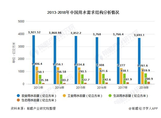 從需求結(jié)構(gòu)看,農(nóng)業(yè)用水一直是用水需求最大的產(chǎn)業(yè),往往超過60%。其次是工業(yè)用水,需求占比約20%,第三用水需求是生活用水,最后生態(tài)用水。2018年,我國農(nóng)業(yè)用水達3693.1億立方米,占比61.39%;工業(yè)用水達1261.6億立方米,占比20.97%;生活用水達859.9億立方米,占比14.29%;生態(tài)用水達200.9億立方米,占比為3.34%。從占比變化趨勢看,生活用水和生態(tài)用水的需求占比逐漸增大,而工業(yè)用水的需求占比逐漸減少。