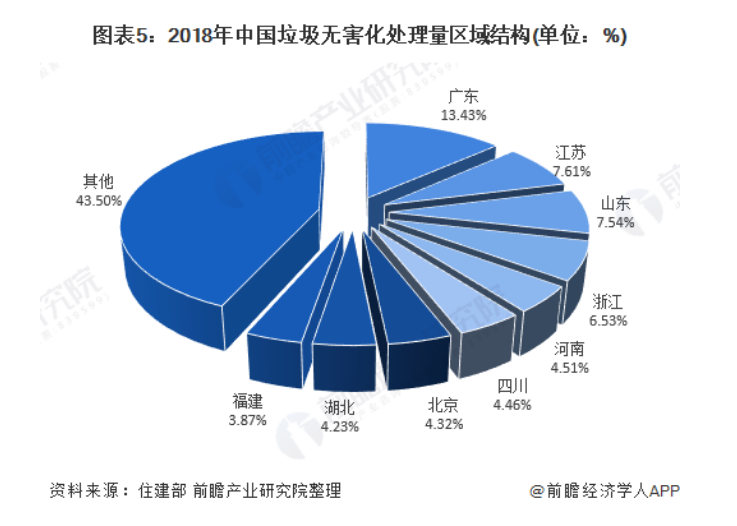 從區(qū)域結(jié)構(gòu)來看,我國沿海地區(qū)垃圾無害化處理量較高,市場潛力較大。2018年,廣東省垃圾無害化處理量最高,為3032萬噸,占全國垃圾無害化處理量的13.43%。其次為江蘇省和山東省,其垃圾無害化處理量分別為1718萬噸與1701萬噸,分別占全國垃圾無害化處理量的7.61%和7.54%。