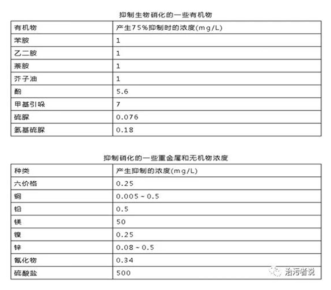 下表羅列了抑制生物硝化的一些污染物質(zhì),需要注意的是這些污染物質(zhì)在污水廠的化驗室的條件下,大部分是無法化驗的,也就造成了污水廠的管理困境,通過常規(guī)項目化驗,無法確定進(jìn)水發(fā)生異常,但是系統(tǒng)受到毀滅性的沖擊,這需要污水廠在這方面采取相應(yīng)的措施來應(yīng)對這種問題。比如根據(jù)廠內(nèi)總停留時間,留存超出總停留時間24小時以上的進(jìn)水水樣(如果具有24小時自動取樣裝置,可以留存更細(xì)的分時段水樣),比如廠內(nèi)總停留時間為30小時,4月15日的進(jìn)水水樣應(yīng)留存到30+24=54小時以后,也就是4月17日以后,這樣可以在出水出現(xiàn)異常以后,及時將留存水樣送往具備化驗?zāi)芰Φ牡谌綑z測機(jī)構(gòu)進(jìn)行檢測,以發(fā)現(xiàn)異常污染物質(zhì),作為生產(chǎn)異常的佐證依據(jù)。
