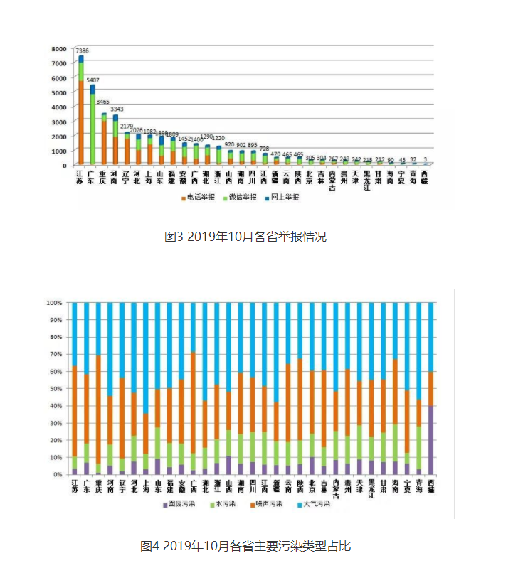 2019年10月,全國接到的舉報中,“12369”環(huán)保舉報熱線電話舉報共19759件,約占47.2%,微信舉報17382件,約占41.6%,網(wǎng)上舉報4524件,約占10.8%,其他渠道168件,約占0.4%。其中,電話舉報同比降低37%,微信舉報同比下降32.7%,網(wǎng)上舉報同比下降32.5%。