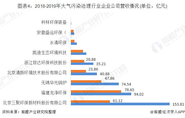 大氣污染治理行業(yè)的周期性、區(qū)域性、季節(jié)性等特征使得行業(yè)內(nèi)企業(yè)發(fā)展同樣具有一定的波動性和區(qū)域性特征。2018-2019年,大氣污染治理企業(yè)中,北京三聚環(huán)保、福建龍凈環(huán)保和無錫華光鍋爐三家企業(yè)營收遠高于其他同行企業(yè)。2018年,北京三聚環(huán)保以153.81億元的營業(yè)收入排名第一;福建龍凈環(huán)保則以94.02億元的營收屈居第二,無錫華光鍋爐以74.54億元位列第三。2019年前三季度,福建龍凈環(huán)保以78.65億元超過北京三聚環(huán)保位列第一,北京三聚環(huán)保以61.12億元屈居第二。
