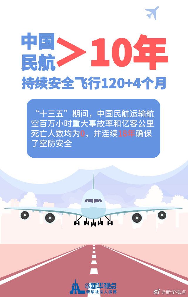 此外,“十三五”期間,中國(guó)民航運(yùn)輸航空百萬(wàn)小時(shí)重大事故率和億客公里死亡人數(shù)均為0,并連續(xù)18年確保了空防安全。截至目前持續(xù)安全飛行“120+4”個(gè)月,安全水平穩(wěn)居世界前列。