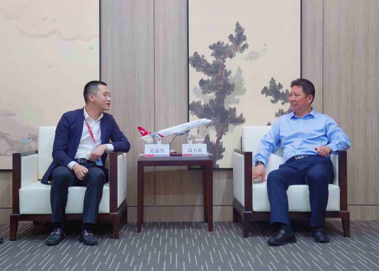 (湖南航空黨委書記、董事長、總裁吳嘉竹與青島航空董事長高玉貞進(jìn)行交流座談)