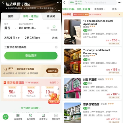 為提升旅客的出境游玩體驗,航旅縱橫推出了海外及中國港澳臺地區(qū)酒店預(yù)訂功能,覆蓋全球200多個國家和地區(qū)的酒店資源,涵蓋經(jīng)濟(jì)型到五星級多標(biāo)準(zhǔn)類型,以滿足不同旅客的需求。通過航旅縱橫預(yù)訂境外酒店,旅客可享受專屬客服、贈送航空公司里程等多項權(quán)益,出行更加輕松便捷。