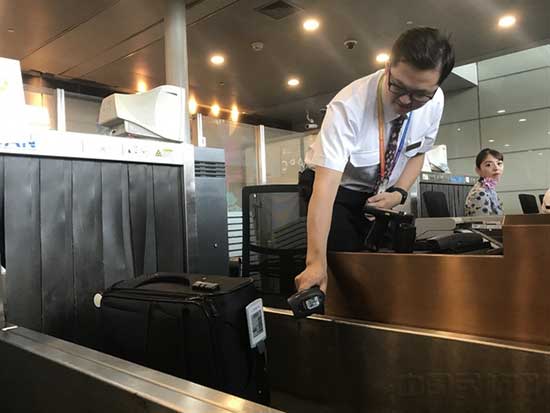 東航工作人員為電子行李牌辦理托運(yùn)(李贊/攝)