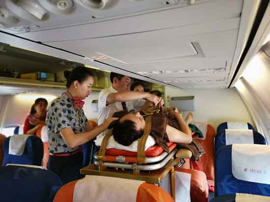 東航萬(wàn)象-昆明航班乘務(wù)組精心安排機(jī)上擔(dān)架旅客(萬(wàn)里/攝)