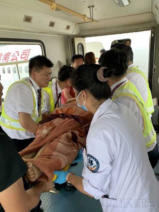 從老撾回國(guó)的擔(dān)架旅客在昆明長(zhǎng)水機(jī)場(chǎng)中轉(zhuǎn)(東航供圖)