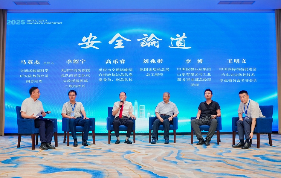 安全論道環(huán)節(jié)由交通運(yùn)輸部科學(xué)研究院數(shù)智公司副總經(jīng)理馬英杰主持。重慶市交通執(zhí)法總隊(duì)副總隊(duì)長高樂睿,天津市消防救援總隊(duì)西青支隊(duì)滅火救援指揮部二級(jí)指揮長李紹寧,中國檢驗(yàn)認(rèn)證(集團(tuán))山東有限公司工業(yè)服務(wù)事業(yè)部總經(jīng)理助理李博,原國家質(zhì)檢總局總工程師、中國質(zhì)量萬里行促進(jìn)會(huì)原會(huì)長劉兆彬,中國國際科技促進(jìn)會(huì)汽車火災(zāi)防控技術(shù)專業(yè)委員會(huì)名譽(yù)會(huì)長王明文圍繞汽車火災(zāi)防控,分享研究成果與實(shí)踐經(jīng)驗(yàn),提出可行性建議。